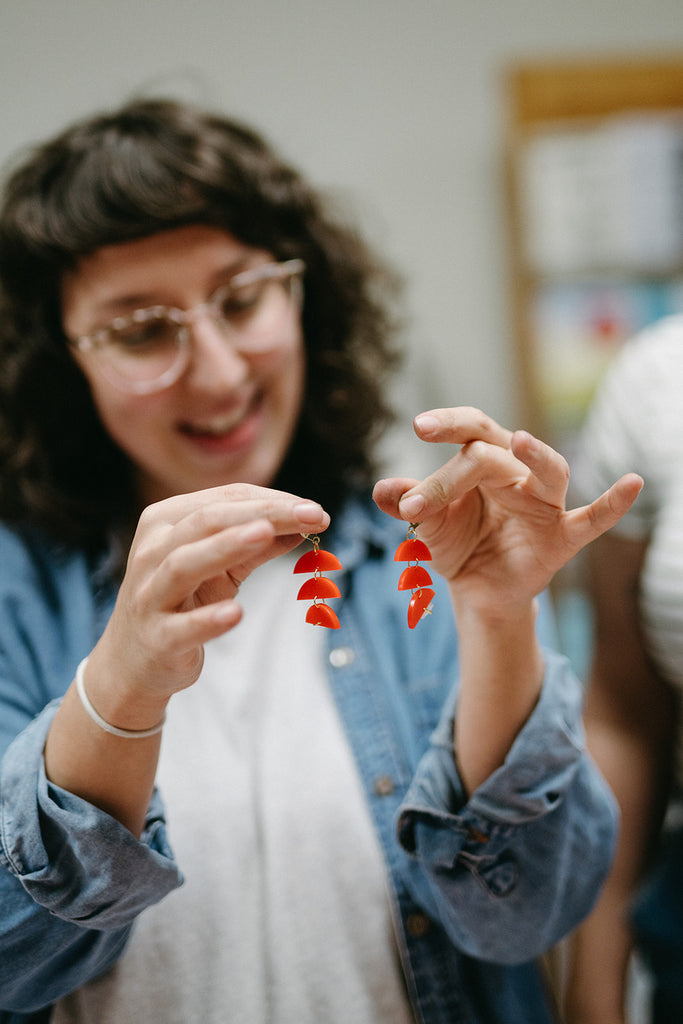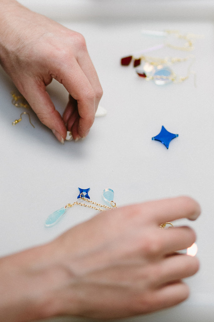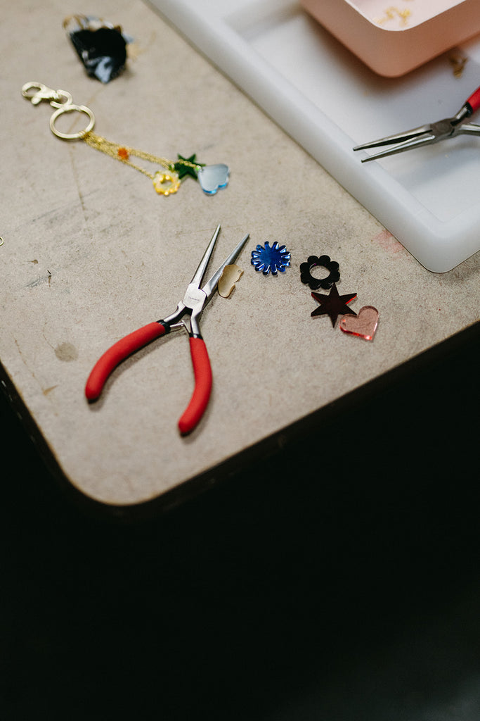 I'll provide a ton of acrylic charms that I have designed and cut in my Portland studio, along with various jewelry findings and tools, to allow you to make your own: