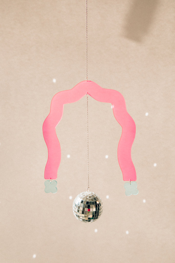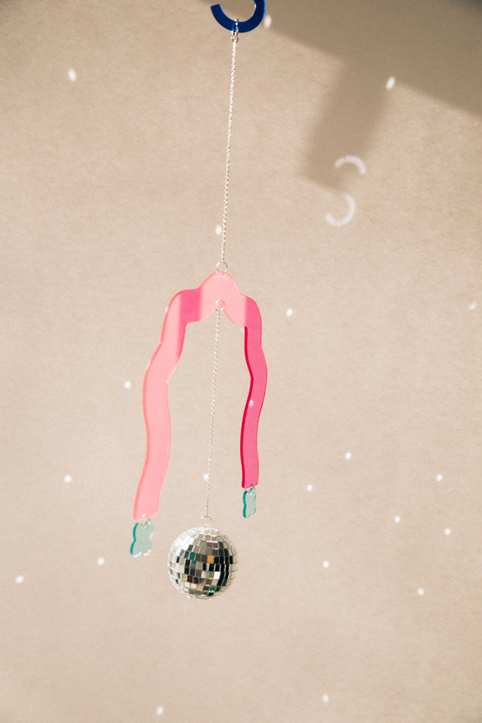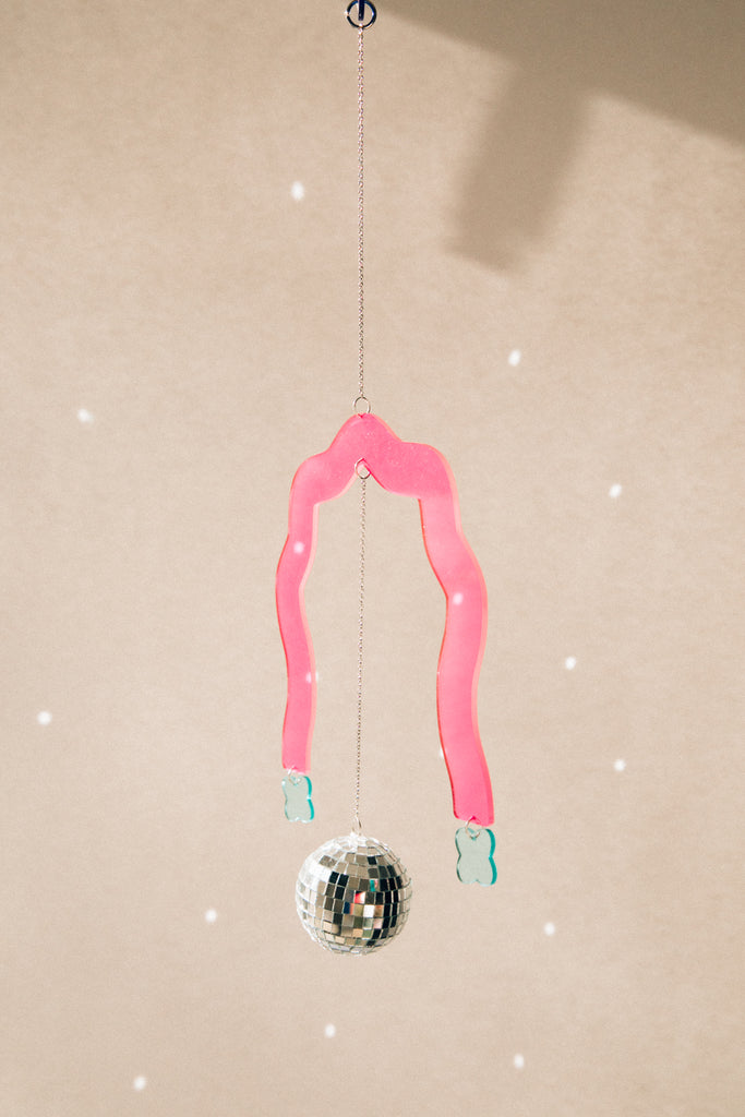 This sweet sun-catcher is bursting with joy and features an arch-shaped acrylic piece, with small charms at either end, a disco ball hanging in the center. Hang from the attached chain.